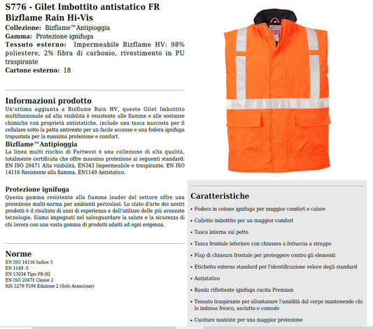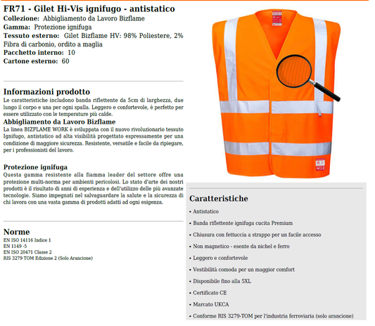 Gilet A/V arancione ignifugo e antistatico cod. FR71 Portwest