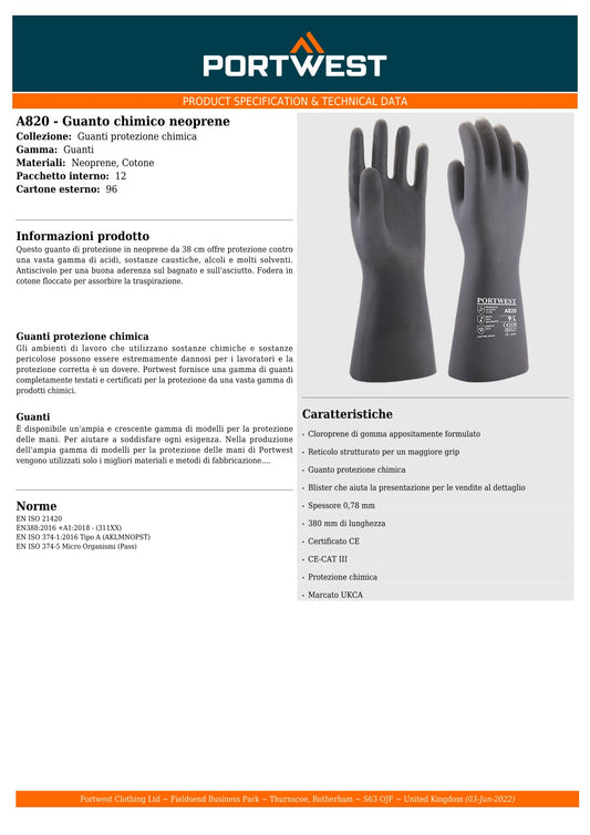 Guanto chimico in neoprene cm.38 cod. A820 Portwest